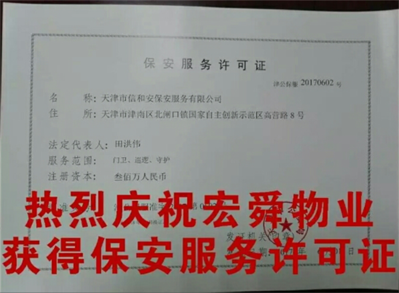 据了解,天津市信安和保安服务有限公司,现已取得天津市公安局颁发的《保安服务许可证》。许可经营服务范围包括,为客户提供门卫、内部巡逻及押运货币、危险品等安保服务;为展览、展销、文娱、防爆、报警、保安通讯等安全防范器材,以及其他安全防范咨询等服务。