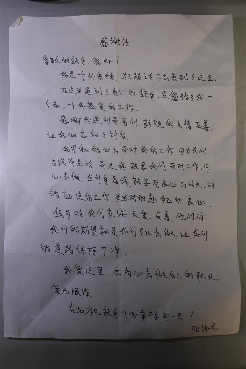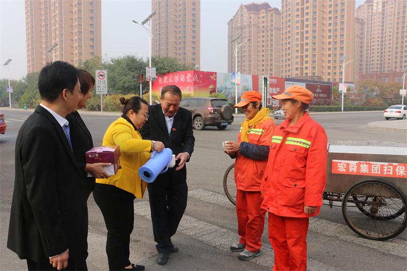 本报讯(记者 李 宁)“尊敬的领导,您好!我是一个外来妹,为了能活下去来到了这里。在这里遇到了贵人、好领导,是宏舜给了我一个家,给了我一个热爱的工作。感谢我遇到的大哥、大姐们,你们的友善让我有了家的归宿感……”这是来自甘肃陇原妹张桃花大姐的一封感谢信。10月26日,是天津市第二十一个环卫工人节,宏舜集团董事长刘炳洪、总裁刘海鑫、办公室主任杨玉芳带领北闸口道路扫保分公司相关负责同志,亲自走访慰问了奋斗在一线的环卫工人代表,为他们送上一杯热腾腾的茶水和御寒必需品,让他们感受来自集团大家庭的温暖。