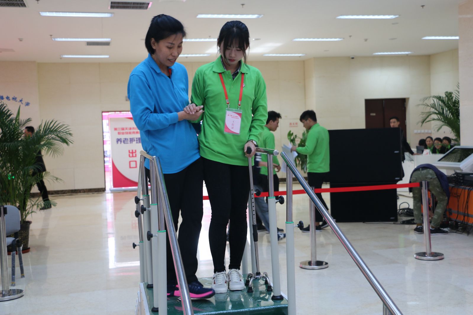 比赛现场分为养老护理员和育婴员两个考区,在养老护理员考区只见护理员一边鼓励着“老人”,一边贴身指导“老人”如何使用拐杖上下台阶……在育婴员考区一名女选手模拟完成“婴儿做运动”的准备工作,只见她一边微笑着对塑料“宝宝”说话,一边轻轻给宝宝弯曲腿部。在考核规定的10分钟里,整个流程比较流畅,操作细致,动作娴熟。比赛结束后,她说:“今天评委老师的要求比较严谨,能够参加这样高水平的比赛我很高兴,了解了自己在操作技能上的不足,对以后提高服务水平很有帮助。”