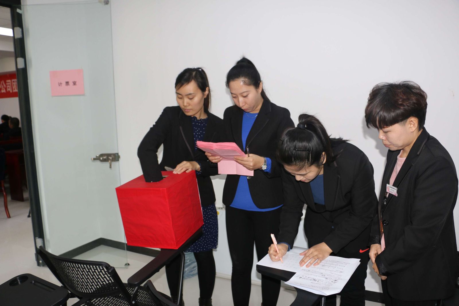 会议按照《团章》及基层团组织选举相关规则、程序要求,经过投票、计票、监票等程序后,由集团34名团员以无记名投票的方式选举出第一届团支部委员会。韩彬当选团支部书记、田洪伟当选团支部副书记,刘欣蕾、杨敏、张娜当选支部委员。